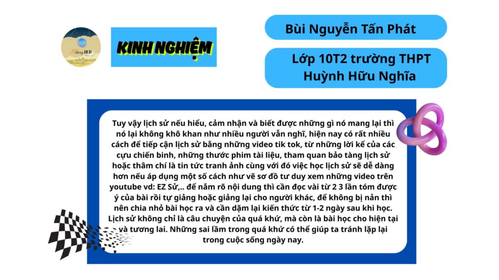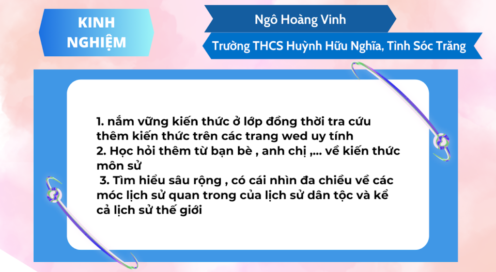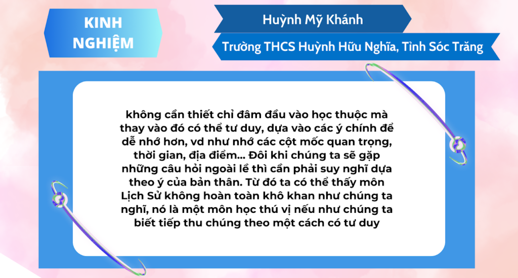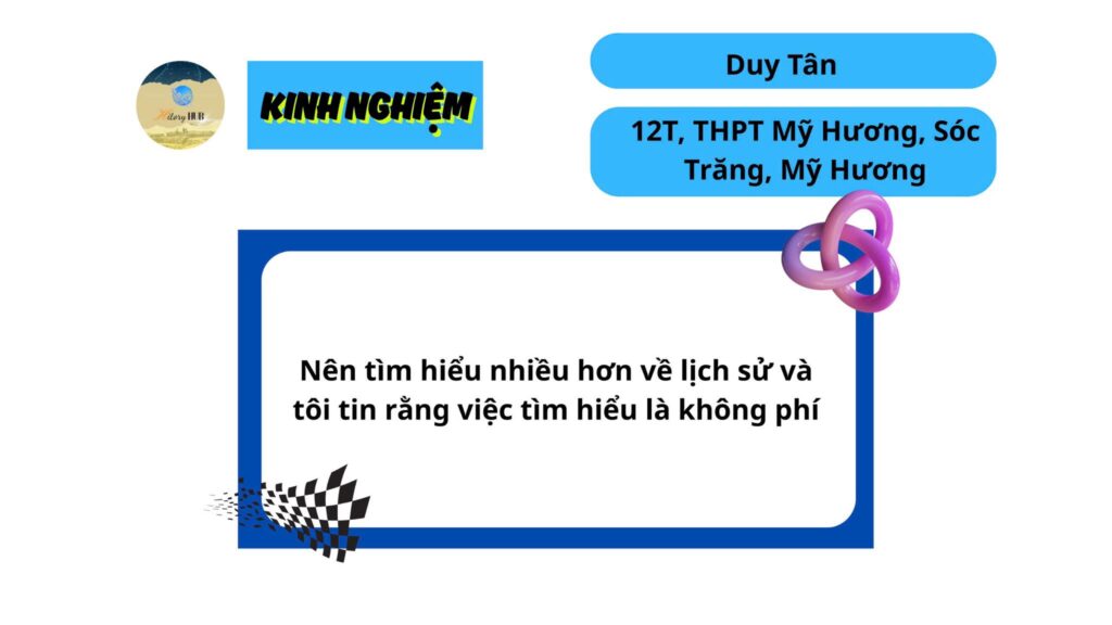 Các bạn hãy chia sẻ những kinh nghiệm, những điều bổ ích trong quá trình học tập môn Lịch sử của mình đến mọi người, biết đâu những điều nhỏ bé đó có thể giúp ích cho một số bạn!