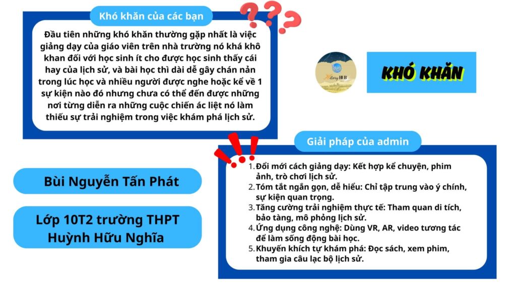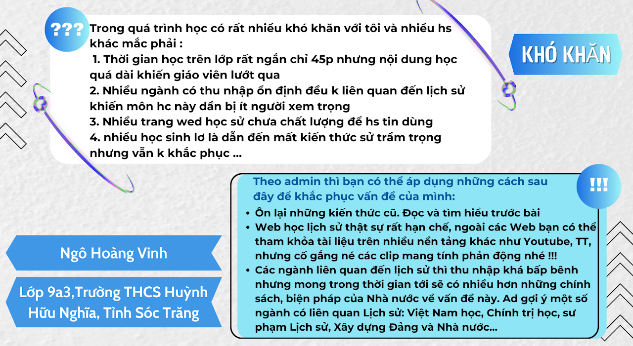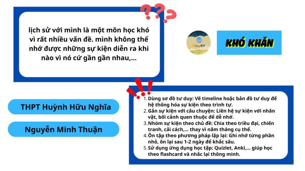 Các bạn hãy chia sẻ những khó khăn của mình trong quá trình học tập môn Lịch sử để Admin và mọi người có thể giúp đỡ bạn!